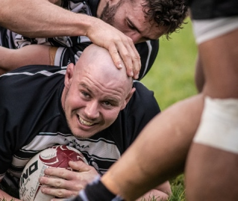 Photo: Nick Selway, scoring his second try, is congratulated by Carl Kirwan. (Image credit David Howlett)